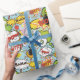 ¡El papel de embalaje del cómic con refranes tiene gusto del auge! ¡Prisionero de guerra! ¡y Poof! Bolas de cañón y nubes del pensamiento en colores de rojo, amarillo, verde en un fondo azul claro.
