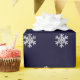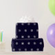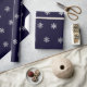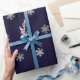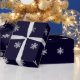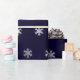 Papel de embalaje del navidad con un modelo de falsos copos de nieve de plata en un fondo azul marino.