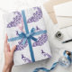 Envolver regalos para la novia y el novio con un rollo de papel envuelto Boda de la hoja de pavo real. El diseño de papel envuelto presenta un fondo de vid de hoja gris claro y blanco con un pavo real violeta de azulejos. También hay artículos de papelería y regalos adicionales para bodas disponibles con este diseño.
