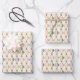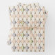El fondo es de color crema, con los diamantes de Harlequin pastel en tonos rosa, melocotón, violeta, dorado y verde.