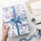 Nuestro "Blue Merry Christmas Wrapping Paper" presenta todos los objetos emocionantes que pertenecen a Navidades, como hombres de nieve, renos, medias, estrellas de árboles de Navidad, cacao caliente, cláusula Santa. Perfecto para las vacaciones.