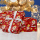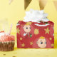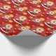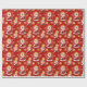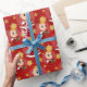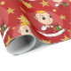 Navidades envolviendo papel con el ilustracion de una linda sonriente niña o niño feliz, el bebé lleva ropa roja y blanca y tiene un regalo; con plantilla de texto editable para tu nombre o mensaje, Navidades diseño de vacaciones con un fondo rojo sin fisuras con estrellas
