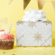 Elegantes Navidades envueltos de papel hecho en blanco, en invierno blanco pálido patrón de puntos de polka y gráficos de copos de nieve dorados. El texto gráfico de tono dorado dice Saludos de temporada.