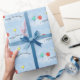 Globos rojos, acuáticos y amarillos flotando en un cielo azul con nubes hinchadas y un saludo de cumpleaños. ¡Una manera tan alegre de envolver tu regalo!