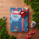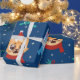 Un patrón repetido de gatos personalizados con ojos grandes y gorras festivos. Los gatos están en tonos azules y naranjas, y uno lleva un sombrero rojo de Santa. Alrededor de los gatos hay púas verdes y arcos rojos, todo ello sobre un fondo azul oscuro con estrellas blancas dispersas.