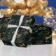 Este papel de envoltura presenta un lujoso diseño giratorio de mármol oscuro con acentos dorados y verdes, perfecto para añadir un toque elegante a cualquier regalo.