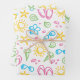 Este juego de regalos incluye una divertida impresión que dice verano. Realizado en tonos vivos de verde, amarillo, rosa y turquesa, la impresión está compuesta por sol, helados, chanclas, gafas de sol, conchas de mar, estrellas y piedras de playa sobre un fondo blanco. Una hoja cada una en verde, amarillo y multi.