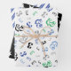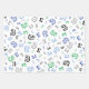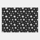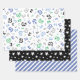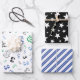 Hojas de papel envueltas de cumpleaños con patrones coincidentes en diferentes tonalidades de azul, verde y negro. Una hoja muestra la edad del niño de cumpleaños en un patrón divertido. Una hoja tiene estrellas blancas en negro. Y un patrón tiene rayas blancas y azules.