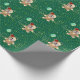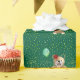 Oso dorado con arco rojo y un globo en la espalda sobre piedras verdes.