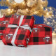 Funny Cránulos de Santa con gafas de sol y rosas sobre un fondo rojo y negro de búfalo chapado.