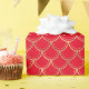 Este papel de envolvimiento presenta un elegante patrón de vieira de Relieve metalizado dorado sobre fondo rojo.