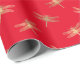 Este papel de envoltura presenta un moderno patrón de libélula de Relieve metalizado de oro falso sobre fondo rojo.