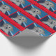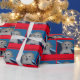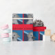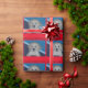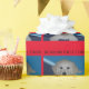 Un hermoso bebé recuperador de oro rodeado de diferentes tonos azules. Saludos de temporada sobre la foto.
