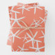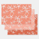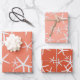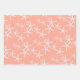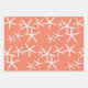Patrón de pez estrella blanco envolviendo hojas de papel en un conjunto de tres. Las estrellas del mar blanco de diferentes tamaños se reparten en tres tonalidades de papel color rosa-naranja. El diseño temático de la playa es para Navidades tropicales, graduación, cumpleaños, limpieza y casi cualquier ocasión.
