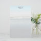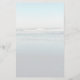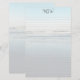 Papel de escritura personal con monograma y líneas. Un fondo ligero de escena de playa tiene olas llegando a la orilla en marea baja. Líneas ligeras cubren el papel en la parte frontal con una plantilla para tres iniciales de monograma en la parte superior. La parte trasera del papel también tiene la escena de la playa.