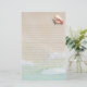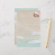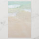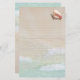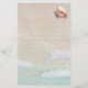 Papel escrito en línea con fondo de arena de playa y concha de concha rosa. Papelería con temática de playa para escribir a mano notas personales a cualquiera. Ambos lados están decorados con arena e imágenes de surf que contienen agua azul turquesa tropical. Las olas están subiendo desde abajo en la parte delantera y abajo desde arriba en la parte trasera. Una imagen de concha reina se sienta en la parte superior y las líneas son de gris claro.
