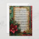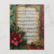 Una tarjeta en capas con papel rojo texturizado, acentos dorados, patrón de hojas verdes y partituras. Adornada con copos de nieve dorados, bayas rojas, ramas de pino y un lazo rojo con bordes de purpurina dorada, creando un tema festivo de Navidad.
