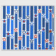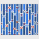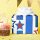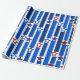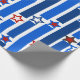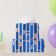 Este papel de envoltura tiene un diseño del 4 de julio de líneas verticales en tonos azules rotas por estrellas de rojo y blanco.