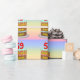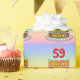 este divertido y alegre diseño de papel de envoltura temática de cumpleaños incluye una representación al estilo personalizado de una torta de cumpleaños de tres niveles con velas en forma de numeral en la parte superior que muestran el número "59", junto con el mensaje "FELIZ 59º CUMPLEAÑOS", y un nombre de destinatario personalizado. El fondo tiene un patrón multicolor de gradiente inspirado en el espectro arcoiris pastel. El papel de envolver como este se puede usar cuando se da un regalo o regalo en honor al cumpleaños 59 de alguien. [~Z0000622]