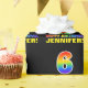 Este alegre, divertido y colorido diseño de papel envolvente de cumpleaños presenta un gran número "6" y el mensaje "FELIZ CUMPLEAÑOS", ambos con un colorante inspirado en el patrón de gradiente del espectro del arcoiris, junto con un audaz nombre del receptor de personalizable amarillo. El fondo es negro de color. Papel de envoltura con tema de cumpleaños divertidos como este podría usarse para envolver un regalo o regalar un regalo para celebrar el sexto cumpleaños de alguien. [~Z0000475]