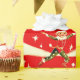 This design features an energetic, repeating pattern of retro-style elves dancing on a snowy landscape against a bright red background scattered with stars.