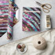 Tiras de concha natural (abulón y Paua) en tal variedad, desde los dorados hasta el delicado azul rosa y clásico. Las tiras forman un patrón agradable, con un color y tono de ondas. Subyacente a esto se encuentra una capa giratoria de mejillón rosado, que proporciona un aspecto tridimensional.