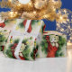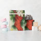 El papel de envolver retro lindo tiene una vintage tarjeta navideña con un pequeño gatito dulce en un caldo rojo. El calzo está decorado con un arco de bonito, un arco de satén rojo, un pino y ramas sagradas, bayas rojas y guirnaldas.