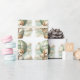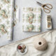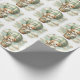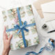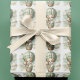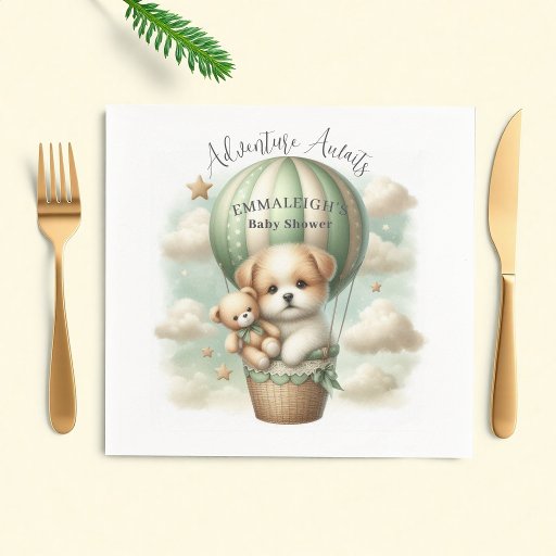"Adventure Awaits" themed baby shower wrapping paper with an adorable white and tan puppy holding a teddy bear riding in a green hot air balloon. The watercolor green sky has white clouds with surrounding gold stars.