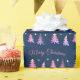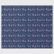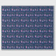 Papel de envoltura azul, adornado con un patrón repetido de árboles rosas, estrellas delicadas y inscripción "Feliz Navidad"