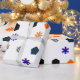 Una impresionante envoltura blanca de regalo adornada con vibrantes formas geométricas en violeta, naranja y negro, perfecta para darle un toque moderno a sus regalos de vacaciones. Ideal para Navidades, cumpleaños o cualquier ocasión especial.