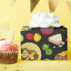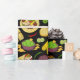 Papel de envoltura con estampado de comida colorido mexicano, con una variedad de platos tradicionales de México incluyendo tacos, burritos, enchiladas, frijoles fritos, empanadas, fajitas, tamales y más