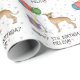 Diseño temático de cumpleaños lindo con el ilustracion original de Destei, personalizado de un bonito color de peña, un perro de raza Greyhound italiano / Iggy. Al lado del perro hay globos de cumpleaños coloridos atados sobre un hueso de perro y una caja de regalo de color morado y amarillo. El fondo está decorado en tonos pastel y con un fondo blanco. También hay un área de texto personalizable.