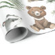 Este elegante diseño presenta una suave vegetación de color verde salado, adorables animales del bosque y letras modernas