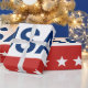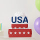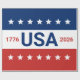 Celebrando el aniversario 250 de EE. UU. Este papel de regalo rojo, blanco y azul tiene la palabra 'EE. UU.' en el centro. Los años 1776 y 2026 están junto a EE. UU. La franja superior es azul con estrellas blancas. La franja del centro es blanca. La franja inferior es roja con estrellas blancas.