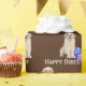 Feliz cumpleaños, un recuperador dorado, con gafas de borde negro sobre fondo marrón con un ramo de globo de punto de polka. Se puede cambiar el color de fondo.