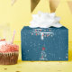 Árbol blanco de Navidad con medias rojas y adornos de béisbol sobre fondo azul y copo de nieve. Se puede cambiar el color de fondo.