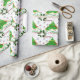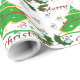 Este diseño presenta un árbol de navidad verde con cinta roja, dorada, verde y blanca y bolas de Navidad decorando el árbol. Los hombres de nieve y los holly decoran este diseño. "Feliz Navidad" está impreso en este diseño. El diseño está embaldosado. Este papel de envolvimiento está disponible en diversos estilos y bordes y fondos de colores.