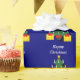 Este sencillo y colorido papel envolvente de Navidades muestra mi diseño de un árbol de Navidad iluminado con velas y presenta en un fondo azul profundo y las editables palabras "Navidades felices"