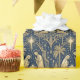 This elegant repeating design features a stylized Nativity scene rendered in luminous gold against a deep navy background. Mary and Joseph kneel beside the infant Jesus beneath a radiant star, framed by graceful architectural arches and tall palm trees. The composition is arranged in a seamless pattern, creating a rhythmic and symmetrical layout filled with celestial stars and refined linework. Inspired by Art Deco styling, the artwork blends sacred Christian symbolism with geometric sophistication. The rich navy and metallic gold palette evokes a peaceful holy night, making it a timeless celebration of faith and the Christmas story.