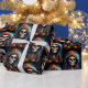 Papel envuelto con un ilustracion de un esqueleto usando una chaqueta encapuchada con el gorra de una bruja naranja encima. Rodeado de calabazas lindas y espeluznantes. Luna brillante en la parte de atrás con un solo bate volando cerca. Divertido diseño de Halloween del otoño.
