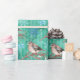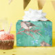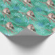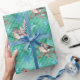 El precioso papel de envoltura tiene pájaros dulces sentados sobre ramas de árboles con copos de nieve cayendo a su alrededor. El fondo es verde con un patrón de rayas claras.