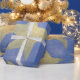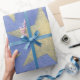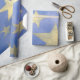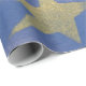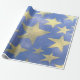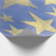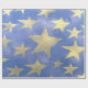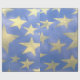 Este papel de envolvimiento presenta grandes estrellas doradas estampadas en un fondo azul. Se puede usar para un tema patriótico o para muchas otras ocasiones.