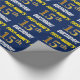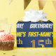 Este diseño de papel envolvente incluye un mensaje como "¡QUINCE CUMPLEAÑOS DE NOMBRE PRIMERO!", en el que el "decimoquinto" tiene un aspecto de color falso/imitación de color dorado, y con el nombre y el "CUMPLEAÑOS" en un tipo de letra divertido y audaz. El nombre se puede personalizar y el fondo es azul. El papel envuelto como este podría ser usado cuando se le dan regalos de cumpleaños a alguien en celebración de su décimo quinto cumpleaños. [~Z0000209]