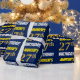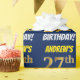 Este diseño de papel envolvente incluye un mensaje como "¡EL CUMPLEAÑOS 27 DE ANDREW!", con el "27" con un aspecto de color falso/imitación de color dorado, y con el nombre y el "CUMPLEAÑOS" en un tipo de letra divertido y audaz. El nombre se puede personalizar y el fondo es azul. El envolvimiento de papel como este podría ser usado cuando se le dan regalos de cumpleaños a alguien en celebración de sus 27 años. [~Z0000209]
