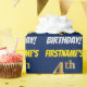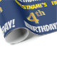 Este diseño de papel envolvente incluye un mensaje como "¡CUARTO CUMPLEAÑOS DE FIRSTNAME!", en el que el "cuarto" tiene un aspecto de color falso/imitación dorado, y con el nombre y el "CUMPLEAÑOS" en un tipo de letra divertido y audaz. El nombre es personalizable y el fondo es azul. El envolvimiento de papel como este podría ser usado cuando se le dan regalos de cumpleaños a alguien en celebración de su cuarto cumpleaños. [~Z0000209]