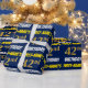 Este diseño de papel envolvente incluye un mensaje como "¡CUMPLEAÑOS 42 DE PRIMER NOMBRE!", en el que el "42" tiene un aspecto de color falso/imitación de oro, y con el nombre y el "CUMPLEAÑOS" en un tipo de letra divertido y audaz. El nombre se puede personalizar y el fondo es azul. El envolvimiento de papel como este podría ser usado cuando se le dan regalos de cumpleaños a alguien en celebración de su 42 cumpleaños. [~Z0000209]