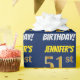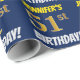 Este diseño de papel envolvente incluye un mensaje como "¡51º CUMPLEAÑOS DE JENNIFER!", en el que el "51º" tiene un aspecto de color falso/imitación de color dorado, y con el nombre y el "CUMPLEAÑOS" en un tipo de letra divertido y audaz. El nombre se puede personalizar y el fondo es azul. El papel envuelto como este podría ser usado cuando se le dan regalos de cumpleaños a alguien en celebración de su cincuenta primer cumpleaños. [~Z0000209]