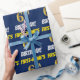 Este diseño de papel envolvente incluye un mensaje como "¡SÉPTIMO CUMPLEAÑOS DE NOMBRE PRIMERO!", en el que el "sexto" tiene un aspecto de color falso/imitación de color dorado, y con el nombre y el "CUMPLEAÑOS" en un tipo de letra divertido y audaz. El nombre se puede personalizar y el fondo es azul. El envolvimiento de papel como este podría ser usado cuando se le dan regalos de cumpleaños a alguien en celebración de su sexto cumpleaños. [~Z0000209]