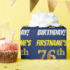 Este diseño de papel envolvente incluye un mensaje como "¡CUMPLEAÑOS 76 DE FIRSTNAME!", en el que el "76" tiene un aspecto de color falso/imitación de color dorado, y con el nombre y el "CUMPLEAÑOS" en un tipo de letra divertido y audaz. El nombre se puede personalizar y el fondo es azul. El envolvimiento de papel como este podría ser usado cuando se le dan regalos de cumpleaños a alguien en celebración de sus setenta y seis años. [~Z0000209]