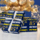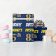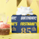 Este diseño de papel envolvente incluye un mensaje como "¡FIRSTNAME’S 85th BIRTHDAY!", con el "85th" con un aspecto de color falso/imitación de oro, y con el nombre y "BIRTHDAY" en un tipo de letra divertido y audaz. El nombre es personalizable y el fondo es azul. El envolvimiento de papel como este podría ser usado cuando se le dan regalos de cumpleaños a alguien en celebración de sus ochenta y cinco años. [~Z0000209]